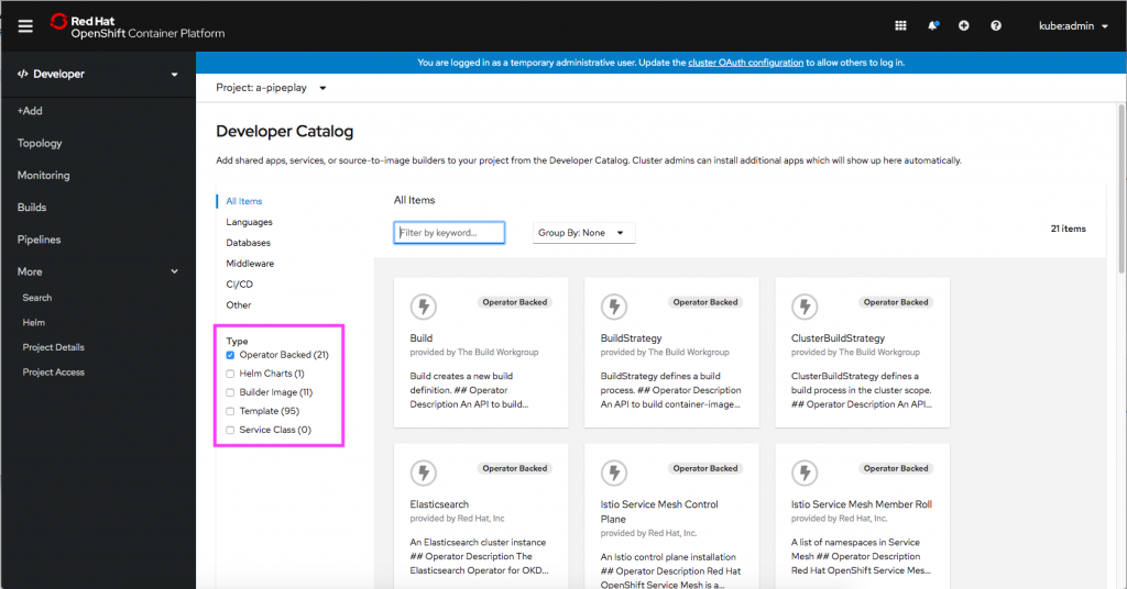 The enhancements to the Developer Catalog include options to allow developers to filter and group items more easily, and labels to help visually identify the difference between catalog items. These enhancements are aimed at making it easier and faster for developers to find the items they’re looking for, such as filtering the Developer Catalog, grouping the Developer Catalog by Operator, and type badges.