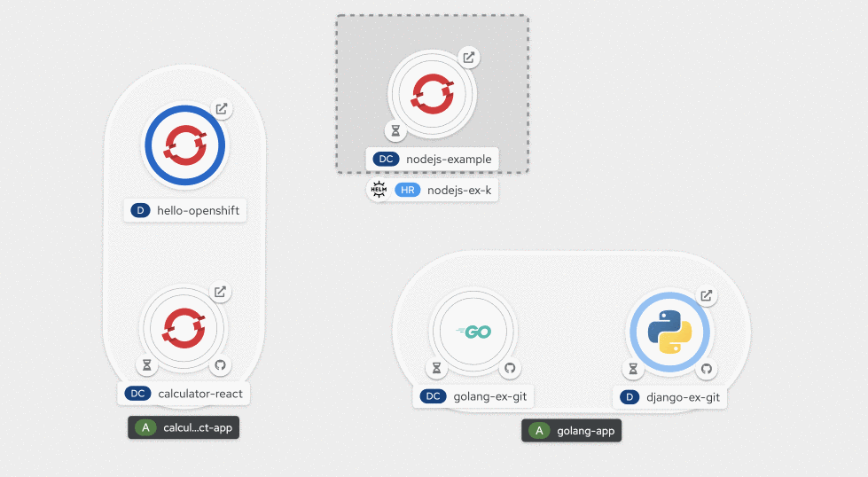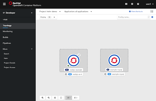 Information about Helm releases can be found in two places in the Developer Perspective. In Topology view, Helm releases are visible and denoted with the Helm icon, as shown in Figure 11.