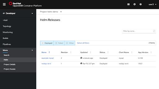 Helm 3 is GA in this release of OpenShift. Developers can now install Helm charts through the Helm CLI as well as the Developer Catalog. Information about Helm releases is displayed in the Developer Perspective.