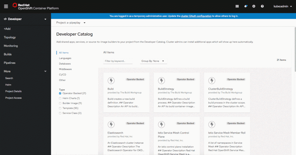 Operator-backed services in the Developer Catalog allow developers to run a variety of workloads that are installed and managed by a Kubernetes Operator. In the Developer Catalog, it’s easy to select and deploy a variety of Operator-backed services.