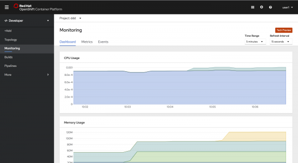 The developer experience in Red Hat OpenShift Container Platform 4.4's web console now includes a metrics-based dashboard. With this dashboard, you can access insights into your application metrics instead of relying on external tools. This Tech Preview feature is available in the Developer perspective’s Monitoring section, providing access to the dashboard, metrics, and events. Monitoring information is also available on the resource side panel, accessible within the Topology and Workloads views.