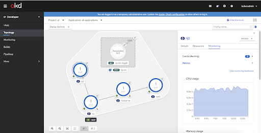 A new Monitoring tab is available on the side panel of the Topology page. This tab displays associated events and metrics associated with the selected workload and is only displayed when a workload is selected. The Metrics section includes CPU Usage, Memory Usage, and Receive Bandwidth charts, and a link to view the monitoring dashboard with the selected resource in context, as shown in Figure 5.