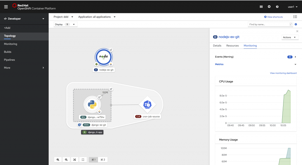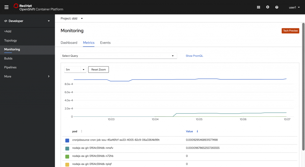 The developer experience in Red Hat OpenShift Container Platform 4.4's web console now includes a metrics-based dashboard. With this dashboard, you can access insights into your application metrics instead of relying on external tools. This Tech Preview feature is available in the Developer perspective’s Monitoring section, providing access to the dashboard, metrics, and events. Monitoring information is also available on the resource side panel, accessible within the Topology and Workloads views.