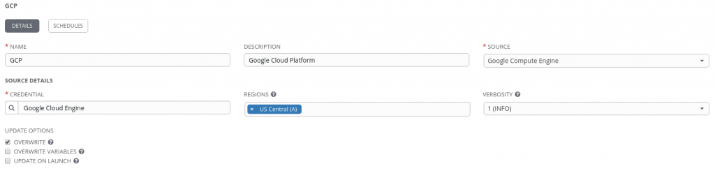 To create a new inventory, choose Google Compute Engine as the source, then select the Google Cloud Platform credential you created at the beginning of this article. Optionally, you can limit the sync to specific GCP regions, as shown in Figure 14.