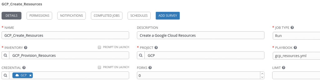 Next, we want to create a new job template to execute the playbook in Ansible Tower. Before we can do that, we need to create an inventory and a project referencing the playbook. For this demo, the project is GCP and the inventory is GCP_Provision_Resources, as shown in Figure 8.