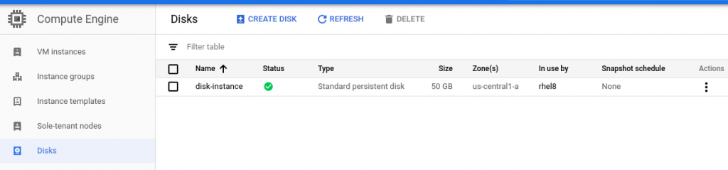 You can also use the Google Cloud Platform console to verify the resources. In Figure 10, you can see the VM disk, disk-instance, was created with a size of 50 GB.
