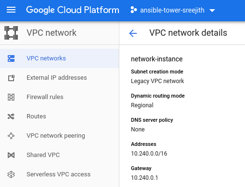 During execution, Ansible Tower will use the GCP_AUTH_KIND environment variable to reference and pass the Google Cloud Platform service account's email, project, and private-key contents to the playbook.