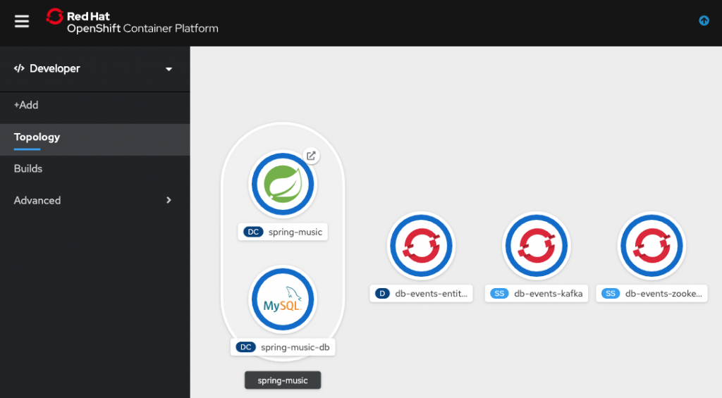 Now that our database is up and running we can start the application. Let's go to the OpenShift web console and then to the Developer perspective's Topology view, as shown in Figure 1.