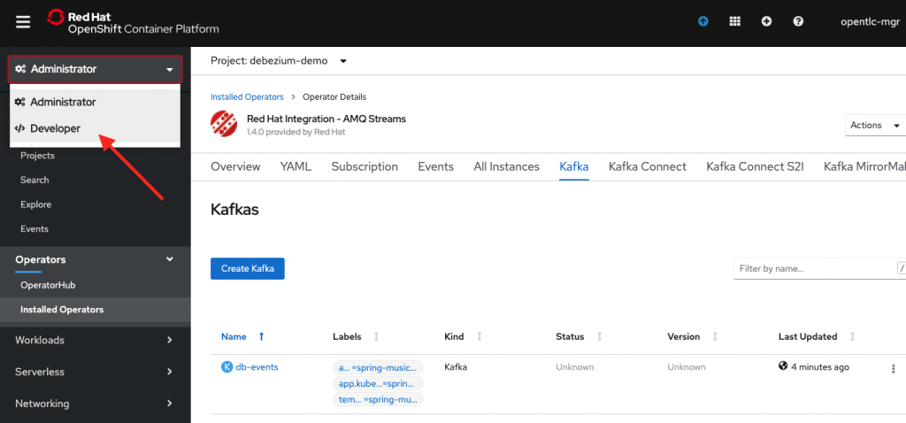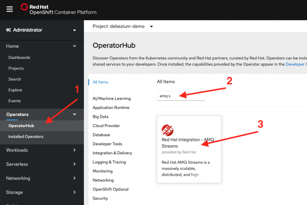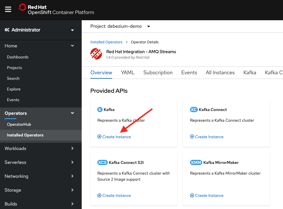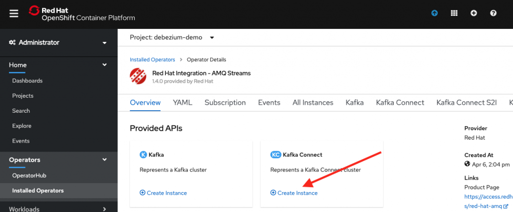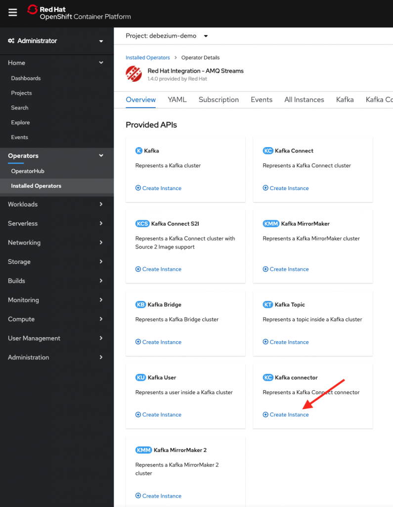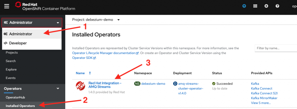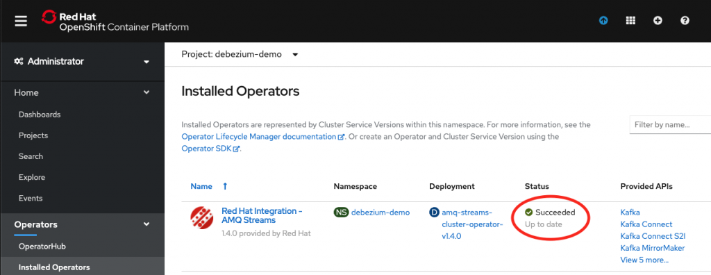Now that our Kafka Connect cluster is up and running we can deploy our Debezium connector configuration into it. Back in the OpenShift console, go back to the Administrator perspective, then Installed Operators, and then click the Red Hat Integration - AMQ Streams operator, as shown in Figure 18.