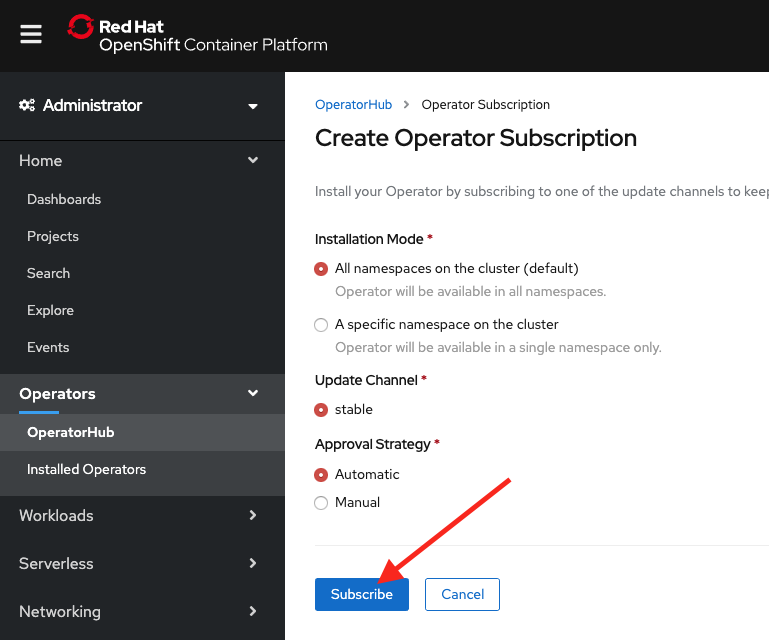 On the Create Operator Subscription page, leave the defaults and click Subscribe, as shown in Figure 9. This action will install the Operator for all of the projects in the cluster.