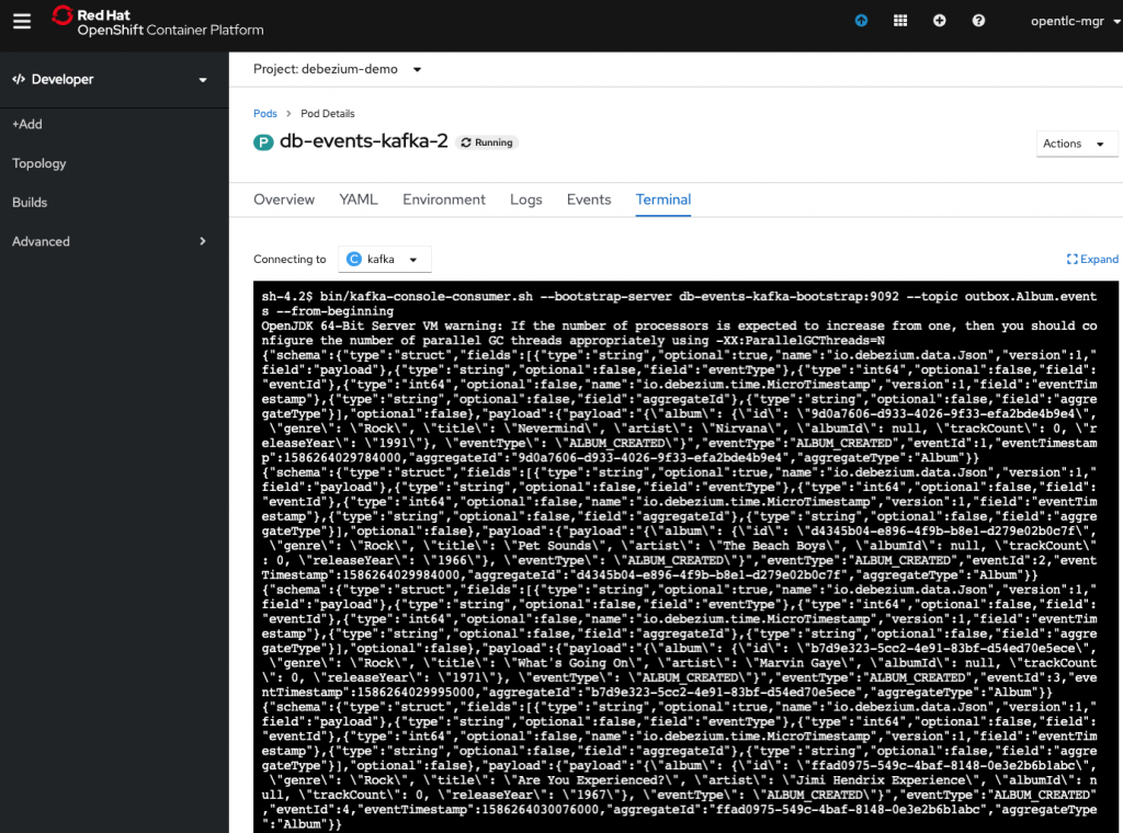 Now, how do we know this all worked? We can go directly to one of the Kafka broker pods and run the kafka-console-consumer utility to see the data in the topic.