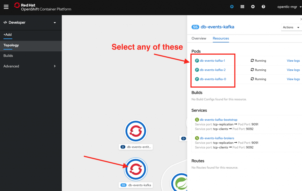 Go back to the OpenShift web console and the Topology view. Click the db-events-kafka resource. When the sidebar appears on the right, click any of the three db-events-kafka pods that show up (i.e., the list in Figure 20). It doesn’t matter which one.