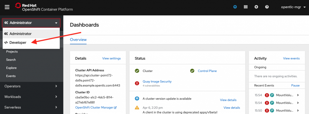 Wait a few minutes for OpenShift to spin everything up. You can switch to the OpenShift Developer perspective’s Topology view by clicking what is shown in Figure 12.