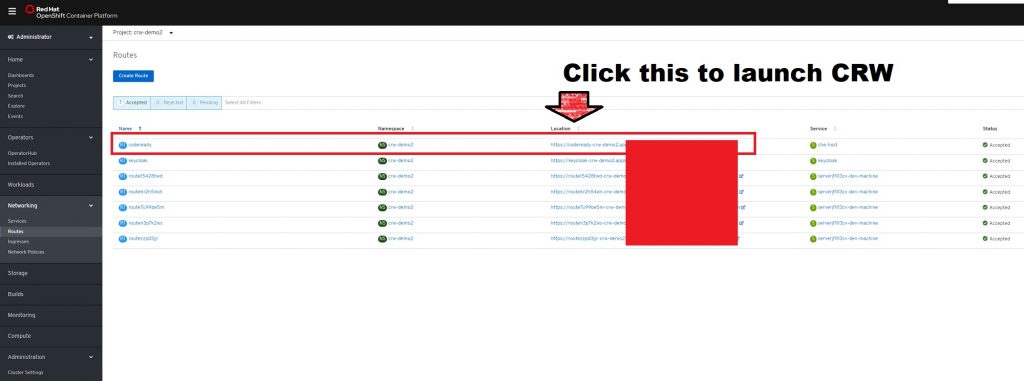 cheservice account is created to pull thecodeready-workspaces/server-rhel8image. - Once CRW is up, the