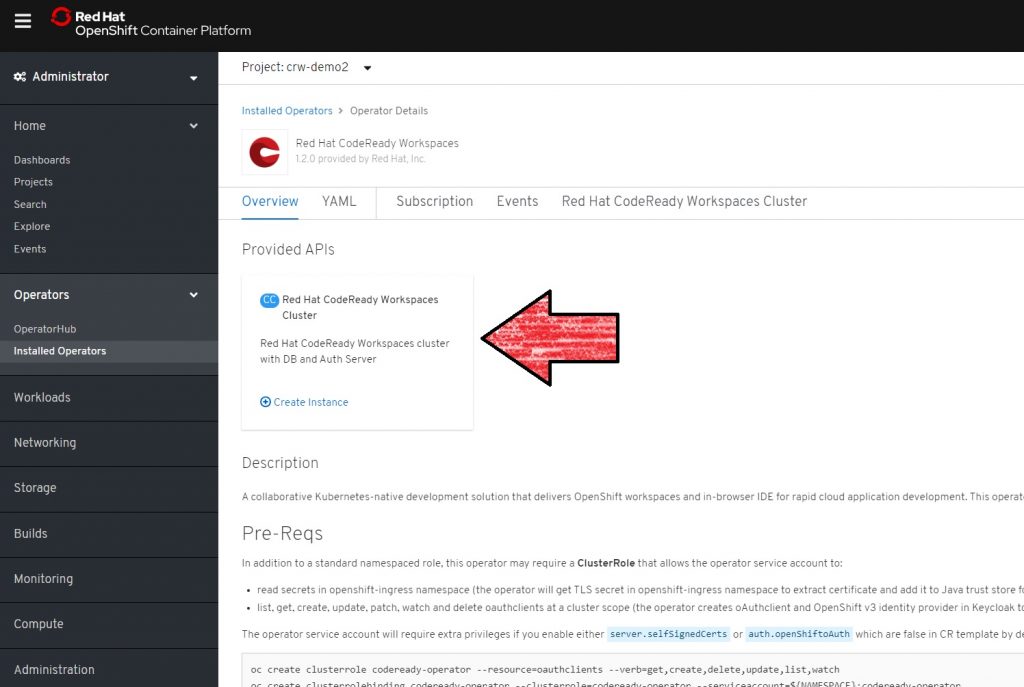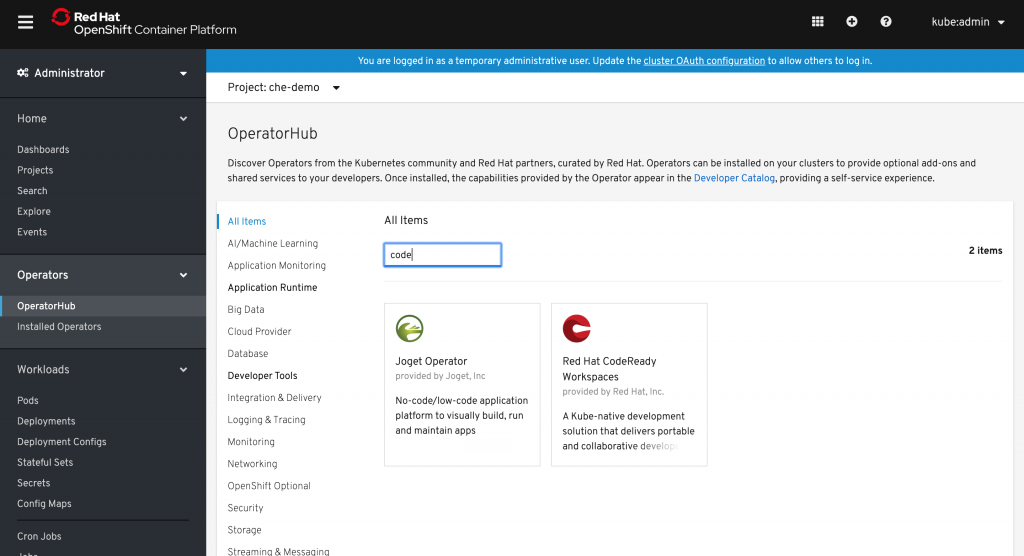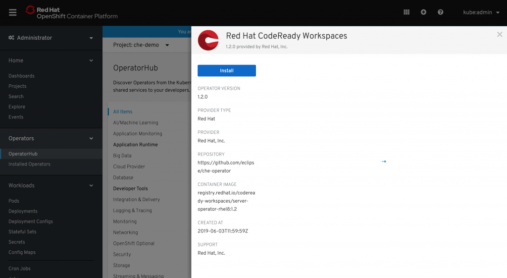 - We will use OpenShift 4's OperatorHub for installation: You could use another method to install CodeReady Workspaces, but I will demonstrate how to use OpenShift 4's built-in OperatorHub.