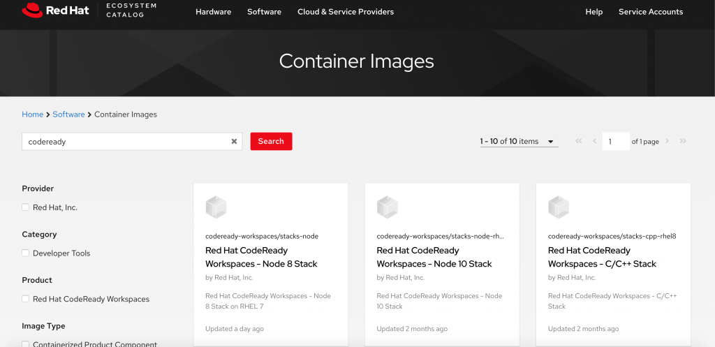 The images that I have outlined in red are required to install CodeReady Workspaces. Use the latest versions available from the Red Hat Registry. The images outlined in blue are stacks, which represent different programming runtimes. Stacks aren't required for your CRW installation, but you will use them in conjunction with a devfile to create new projects. I will introduce you to the process of importing stacks in Part 2. The image outlined in green (in the upper-right corner of the screenshot) is a package name.