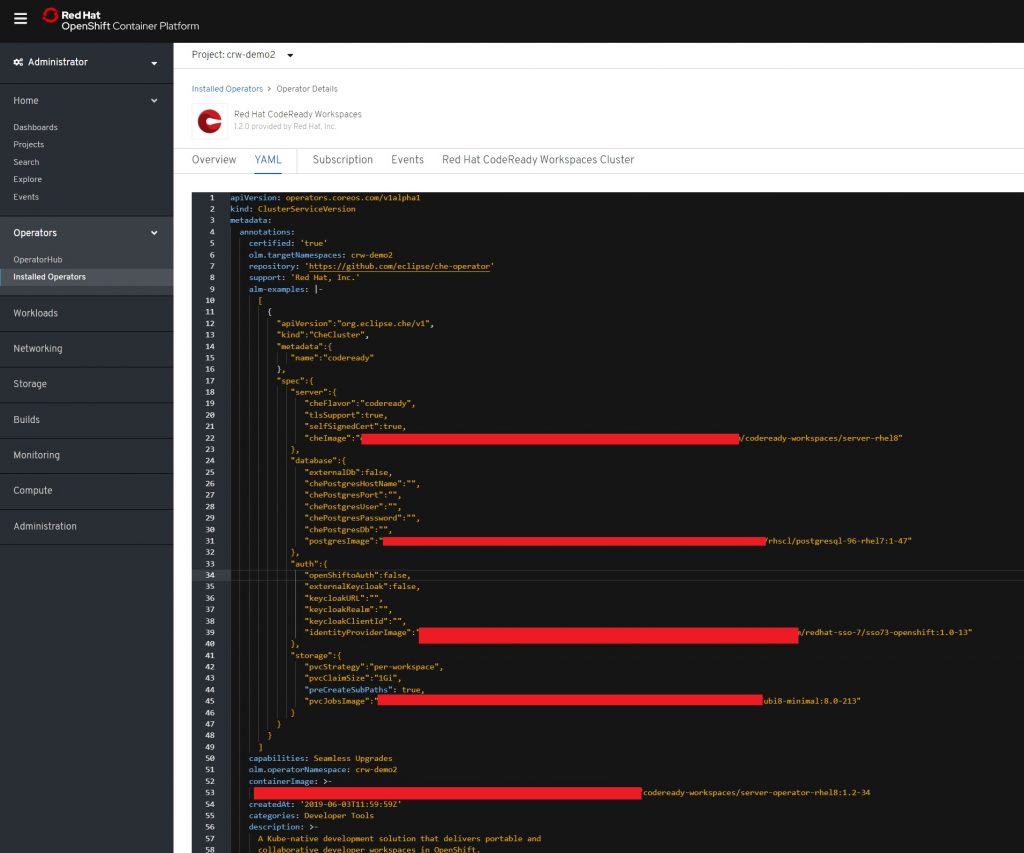codeready-workspaces/server-operator-rhel8:2.0: The CodeReady Workspaces Operator orchestrates and manages the installation process. It is especially important to have this Operator installed for OpenShift 4.x.codeready-workspaces/server-rhel8:2.0: This is the Che server. It provides the main platform to manage workspaces and aspects of the project, such as programming stacks, user groups, and the factory. You will also use the Che server to view your project dashboard.redhat-sso-7/sso73-openshift:latest: CRW uses Red Hat Single Sign-On (SSO), which is based on Keycloak. This enterprise implementation is compliant with SAML 2.0 and OpenID. You will need it to authenticate, authorize, and manage users in CodeReady Workspaces.
