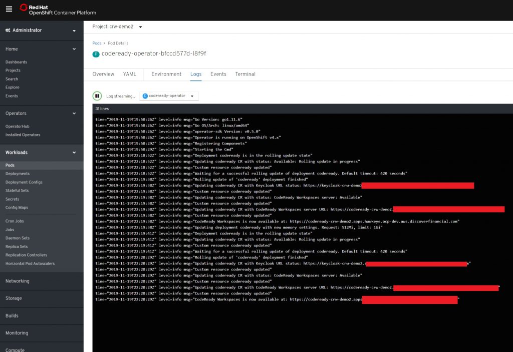 When you proceed with installing a new CRW instance, your pods will probably fail. To check this in the OpenShift console, go to Workloads -> Pods, then click the pod that you are interested in. As an example, you could click Log.
