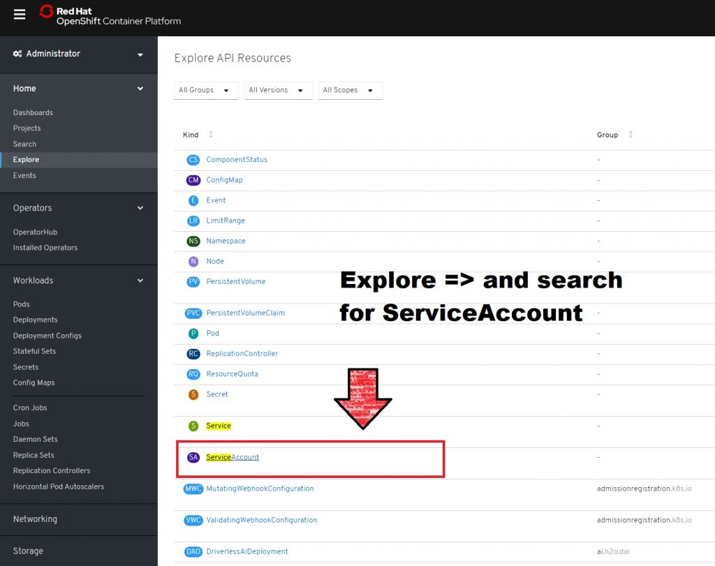 You can find the above service accounts in the OpenShift console by clicking Explore and browsing until you find the ServiceAccounts page, as shown in Figure 14.