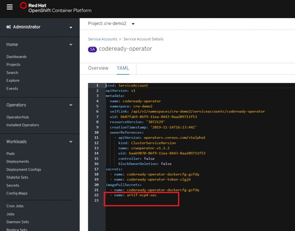 The first time that you try to install CRW, you should only see the codeready-operator service accounts, which are default, builder, and deployer. You will have to use your OpenShift secret to add the additional service accounts. In the custom resource definition file, create a new line under imagePullSecrets and add a new OpenShift secret there. Alternatively, you could override the previous OpenShift secret, as shown in Figure 15.