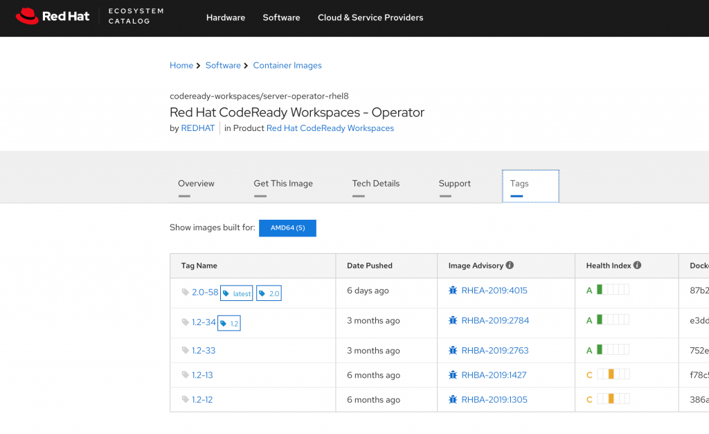 When you locate a container image that you need, select the image, and click the Tags tab to see the image name and version information. You will specify this information later, to pull the images from the Red Hat Container Registry. As of this writing, the version number for the CodeReady Workspaces Operator is 2.0, as shown in Figure 2.