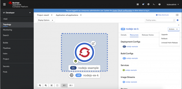 You can access these actions from the web console's Topology view, using the Actions menu in the Topology side panel, as shown in Figure 4. Another option is to use the Actions menu on the Helm Releases page.