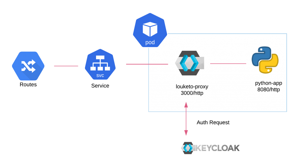 Louketo Proxy (previously Keycloak-Gatekeeper) integrates with OpenID Connect (OIDC)-compliant providers like Keycloak. Louketo Proxy hands off the authentication to Keycloak, and then passes the authorization and user details to a microservice as header attributes. The diagram in Figure 1 illustrates the authentication flow between Louketo Proxy, Keycloak, and a microservice.