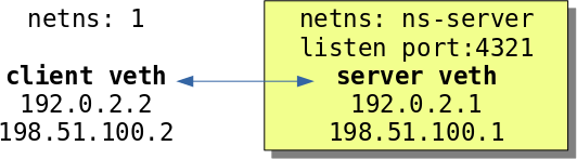 The test network topology shown in Figure 1 consists of a client and a server that run in separate namespaces, connected through a virtual ethernet device (veth).