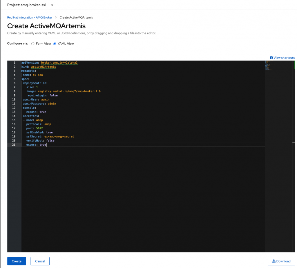 Now, copy and paste the ActiveMQArtemis custom resource below into the Create ActiveMQArtemis YAML editor. Notice the acceptors stanza in the YAML file, where we define the AMQP acceptor: