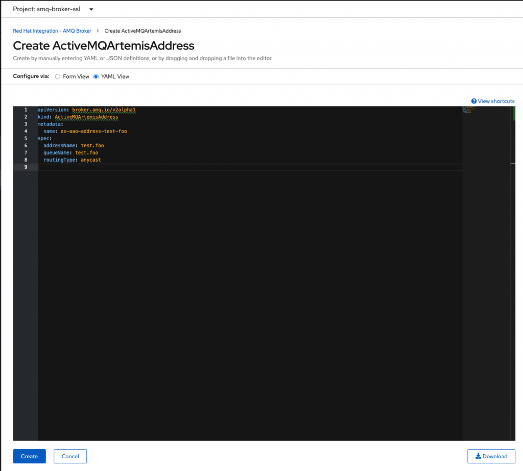 Copy and paste the following YAML for the ActiveMQArtemisAddress custom resource into the YAML editor: