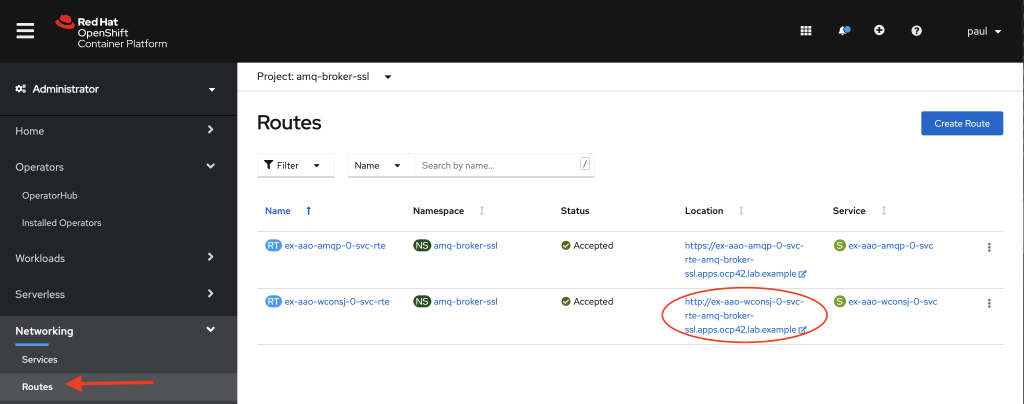 The broker pod in our deployment has a service that provides access to the console. This service has a corresponding route, ex-aao-wconsj-0-svc-rte. To get the URL to access the broker console, Click on Routes under Networking over on the left navigation pane. You'll see two routes. Click the link that corresponds to this route as shown in Figure 16