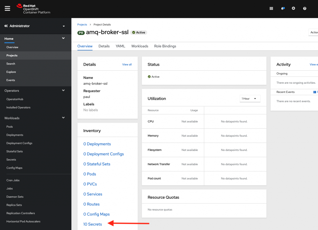 Click Secrets in the Inventory panel shown in Figure 2. Find the ex-aao-amqp-secret, which appears in the list of secrets shown in Figure 3.