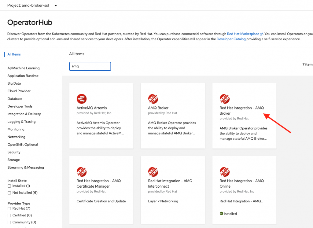 Log in to the web console as a cluster admin. On the left-side navigation bar, expand Operators and click on OperatorHub. In the search field, type AMQ, and select the Red Hat Integration – AMQ Broker tile, as shown in Figure 5.