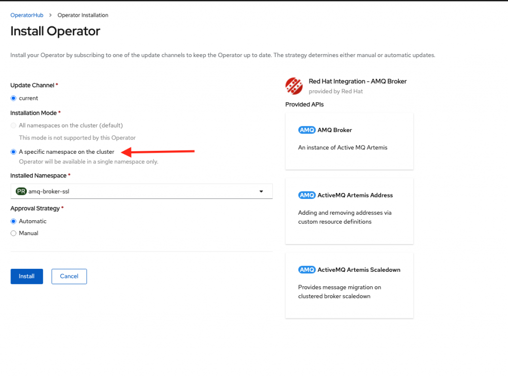 Be sure to select a specific namespace on the cluster and keep the defaults for the Update channel and Approval strategy. Select amq-broker-ssl under Installed Namespace*, as shown in Figure 7.