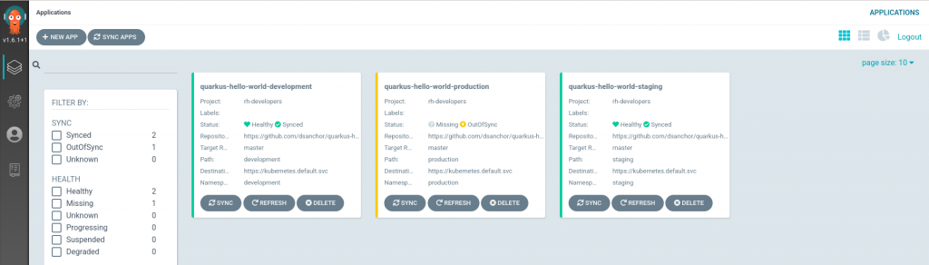 $ ./add-argo-apps.sh cicd rh-developers https://github.com/dsanchor/quarkus-hello-world-deployment.git master ---------------------------------------------------------------------------------------------------------------- Installing basic Argo CD server instance argocd.argoproj.io/argocd created Adding edit role to argocd-application-controller ServiceAccount in projects development, staging and production rolebinding.rbac.authorization.k8s.io/edit-rh-developers-dev created rolebinding.rbac.authorization.k8s.io/edit-rh-developers-staging created rolebinding.rbac.authorization.k8s.io/edit-rh-developers-production created Creating rh-developers AppProject in namespace cicd appproject.argoproj.io/rh-developers created Creating Applications in namespace cicd in rh-developers AppProject application.argoproj.io/quarkus-hello-world-development created application.argoproj.io/quarkus-hello-world-staging created application.argoproj.io/quarkus-hello-world-production created