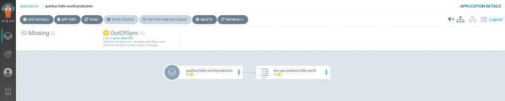 When you check the Argo CD dashboard, shown in Figure 14, you should observe that quarkus-hello-world-production application is OutOfSync. The Knative service object is the affected object.