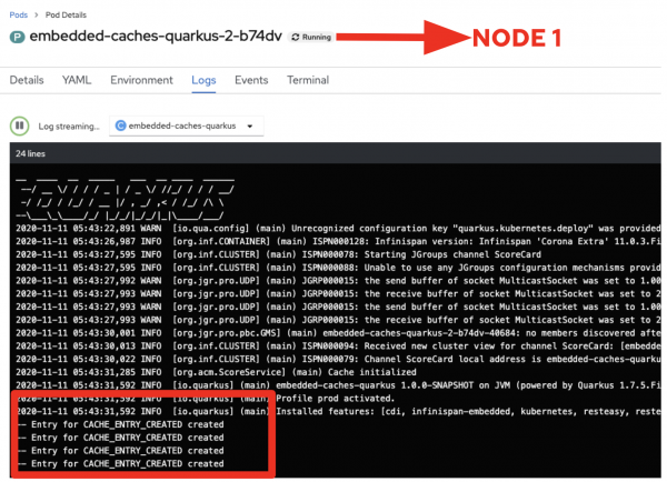 Return to the topology view and click View logs for each pod in its own web browser. This lets you monitor cache events from CacheListener. You should see the same cache entry logs in both Data Grid nodes. Figure 3 shows the output from Node 1.