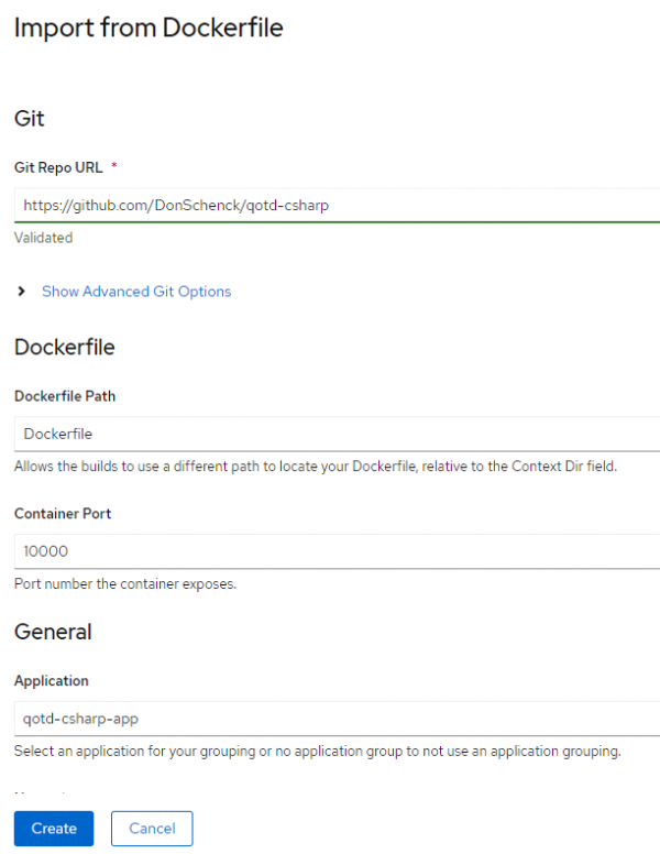 Because we have a valid Dockerfile, we can use the Import from Dockerfile option. Note that we need to make sure we have the correct port—in this case, 10000, as shown in Figure 5.
