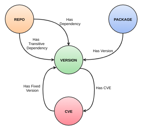 - Has dependency: A one-to-many relationship between repo/package and version.