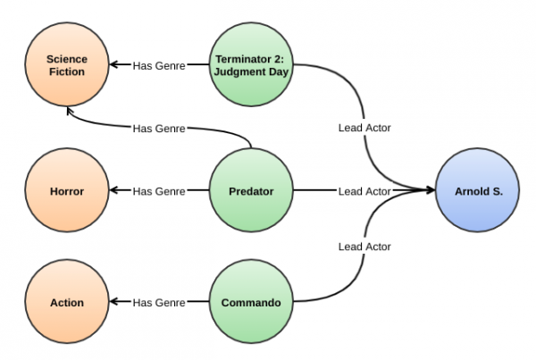 Assume that a viewer has watched only one movie on the company's platform (for example, Terminator 2: Judgement Day) and we have only the preceding information in our knowledge graph. The system can find the other movies with the same lead actor (in this case, Predator and Commando). To build in user preference, the system can also consider genre information. We see that Terminator 2: Judgement Day and Predator both fall under the Science Fiction genre. Given the limited data for this viewer, the recommendation system can easily rank the other movies they might enjoy—Predator, followed by Commando.