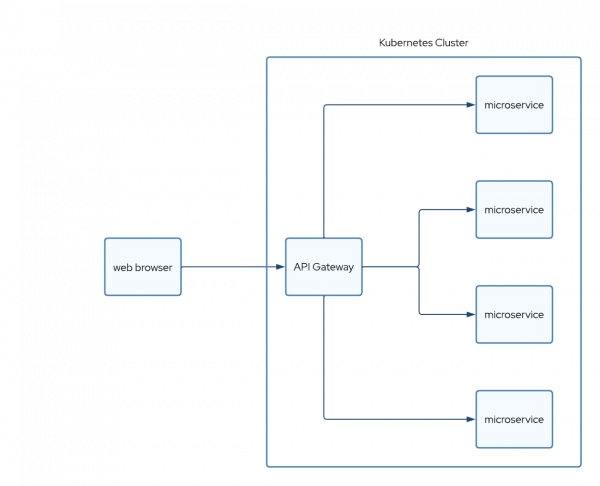 A service design model — an implementation of the facade design pattern — where a client (e.g. a website) talks to one and only one service: The API Gateway. The API Gateway, in turn, handles all traffic to the other services and then back to the calling client.