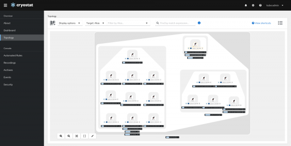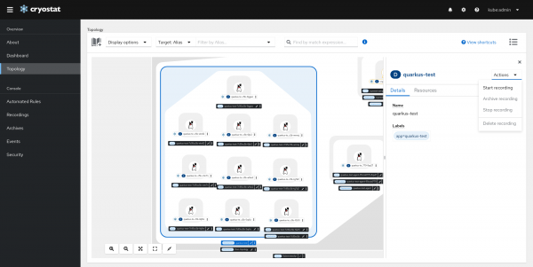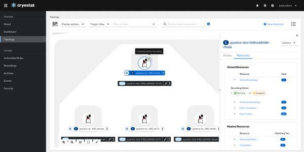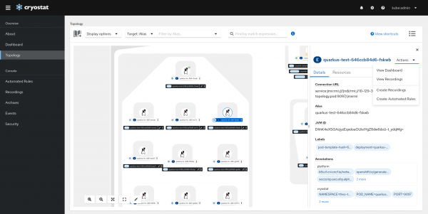 With Cryostat 2.3, a brand new Topology View is introduced to provide a visual presentation of the all discovered JVMs and all resources that are associated with them. It also allows users to perform actions on one or multiple targets.