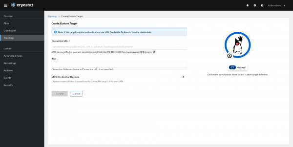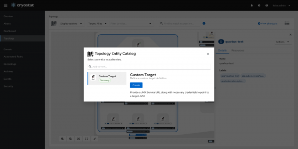 Since Cryostat 2.0, Cryostat allows defining Custom Targets for JVM applications that Cryostat cannot automatically discover. In Cryostat 2.3, Custom Target form is given a new look and can be navigated from the Topology Entity Catalog.