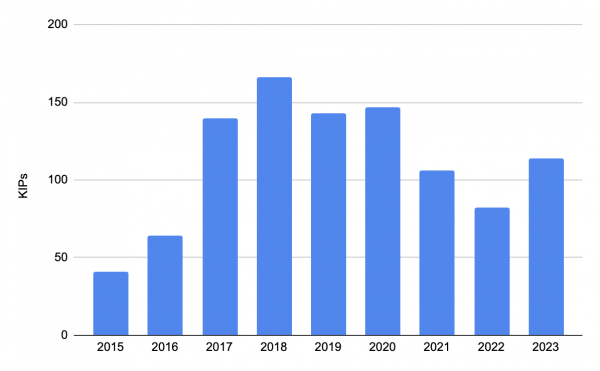 In the past 12 months the community raised 116 KIPs, crossing the 1000th KIP mark in November. Figure 2 shows how this compares to previous years.