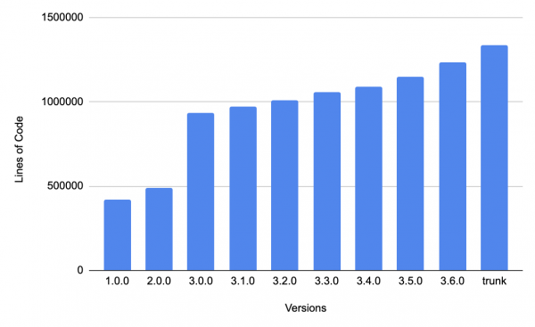 This year 59 unique contributors made more than 1100 commits. Figure 3 shows the size of the code base, in lines of code, for a few releases.