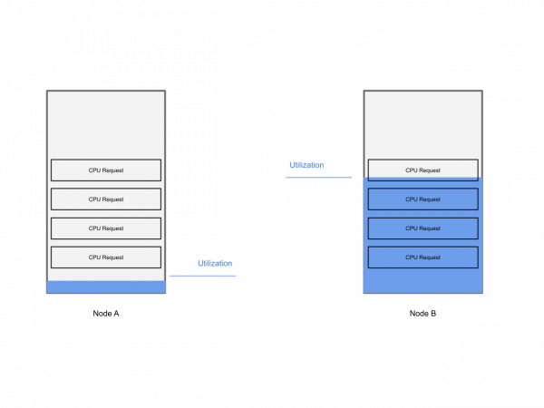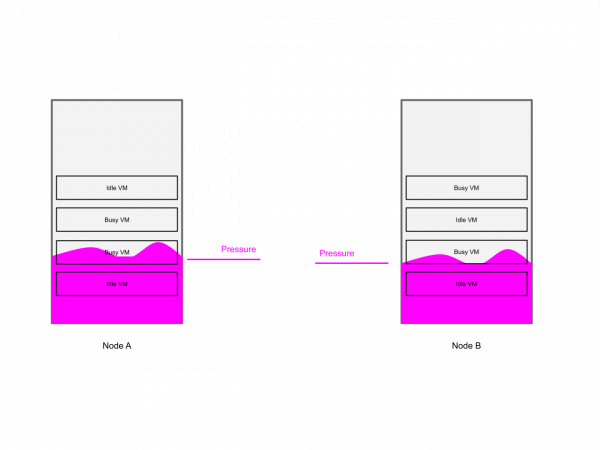 Let’s take the example of where we have 4 equally sized VMs (i.e. 4 vCPUs each), spread across two nodes. While the VMs are equally sized, they differ in the resource utilization: On the first node, both VMs are busy (high CPU utilization), and on the second node, both VMs are idle (low CPU utilization). In this example, the VMs on the first node are likely to experience a negative performance impact due to CPU contention.