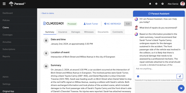 As mentioned in the first post, a chatbot was constructed for users of the application to ask it questions about the claims to better service their customers. The user could ask something like: “What happened here?” and the chat bot would give a succinct summary of this claim.