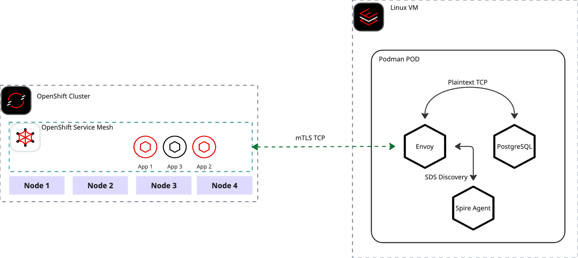 cat <<EOF | oc apply -f - apiVersion: route.openshift.io/v1 kind: Route metadata: name: spire-server namespace: ${ZTWIM_NS} spec: host: ${SPIRE_SERVER_DOMAIN} port: targetPort: grpc tls: termination: passthrough to: kind: Service name: spire-server weight: 100 EOFConnect to the remote server and run the Spire-Agent. To maintain distribution independence and simplify the tutorial, all workloads on the remote VM will run as containers using Podman. Since PostgreSQL does not natively support SPIFFE, we will use Envoy as an mTLS terminator for the database instance. For straightforward connectivity between the spire-agent, Envoy, and the DB, all containers will be co-located within a single pod.