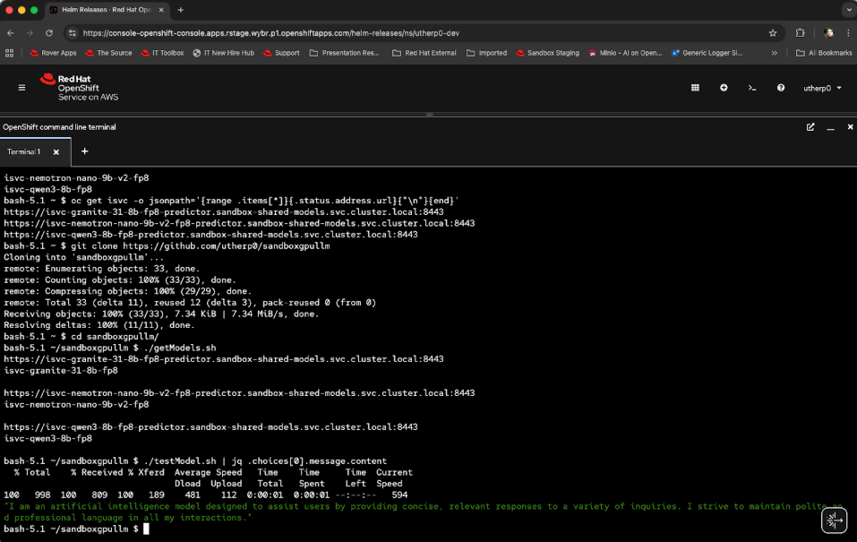 curl -kL -H "Authorization: Bearer "$(oc whoami -t) -H "Content-type: application/json" https://isvc-granite-31-8b-fp8-predictor.sandbox-shared-models.svc.cluster.local:8443/v1/chat/completions -d '{"model":"isvc-granite-31-8b-fp8", "messages": [{"role":"system", "content":"You are an assistant that speaks in polite english"}, {"role":"user", "content":"What kind of model are you?"}]}' | jq .choices[0].message.content curl -kL -H "Authorization: Bearer "$(oc whoami -t) -H "Content-type: application/json" https://isvc-nemotron-nano-9b-v2-fp8-predictor.sandbox-shared-models.svc.cluster.local:8443/v1/chat/completions -d '{"model":"isvc-nemotron-nano-9b-v2-fp8", "messages": [{"role":"system", "content":"You are an assistant that speaks in polite english"}, {"role":"user", "content":"What kind of model are you?"}]}' | jq .choices[0].message.content curl -kL -H "Authorization: Bearer "$(oc whoami -t) -H "Content-type: application/json" https://isvc-qwen3-8b-fp8-predictor.sandbox-shared-models.svc.cluster.local:8443/v1/chat/completions -d '{"model":"isvc-qwen3-8b-fp8", "messages": [{"role":"system", "content":"You are an assistant that speaks in polite english"}, {"role":"user", "content":"What kind of model are you?"}]}' | jq .choices[0].message.contentThis script has the
