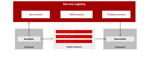 A service registry allows developer teams to search the registry for existing schemas and register new ones. The stored schemas can be used to serialize and deserialize messages (Figure 7). Before producing and consuming messages, client applications can check the schema to ensure that the messages that they send and receive are compatible with it, and therefore can be correctly parsed and consumed.